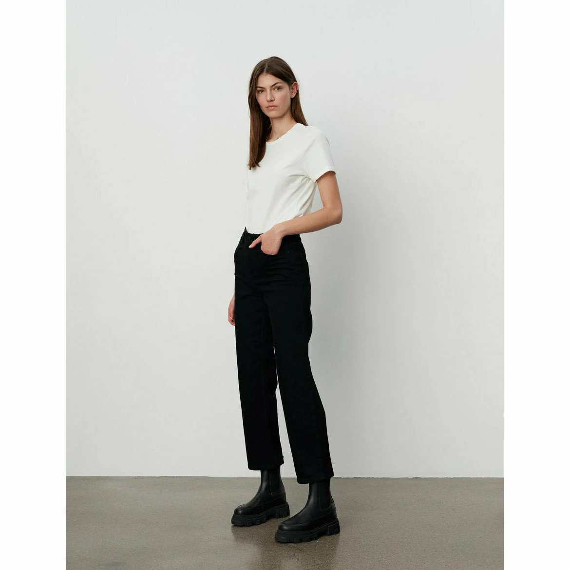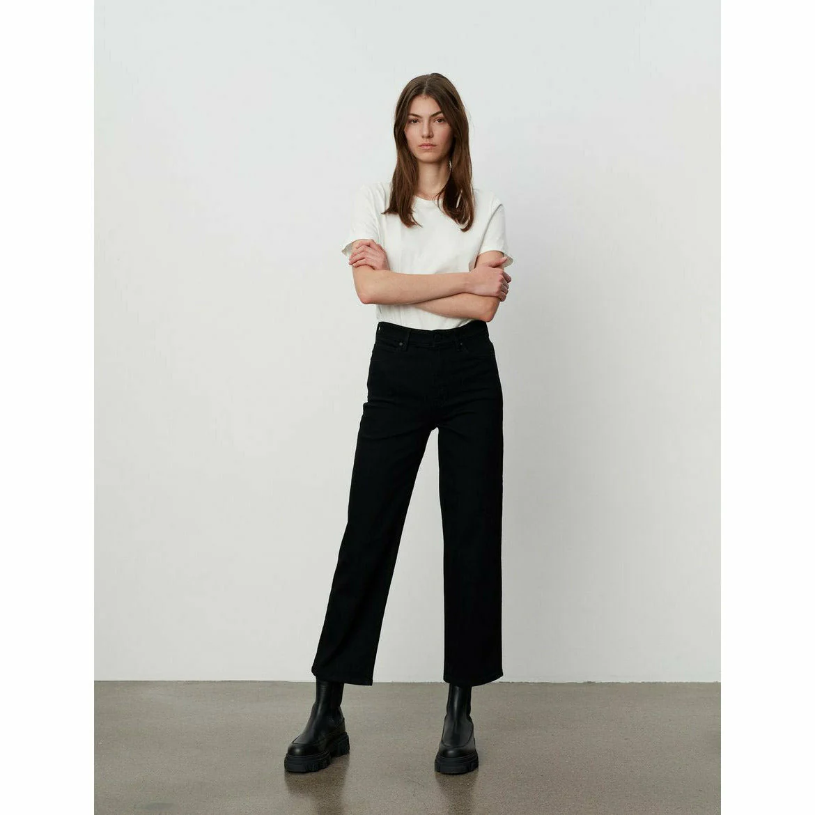 Svarta stretchiga jeans med hög midja & raka ben. Knäppning med gylf i fram, fickor fram & bak. Byxbenen är ca 30′ – längd.