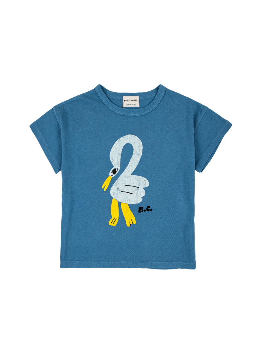 Blå kortärmad t-shirt med en pelikan tryckt på bröstet, från Bobo Choses SS23-kollektion Living In a Shell. Tröjan har en rund halsringning.