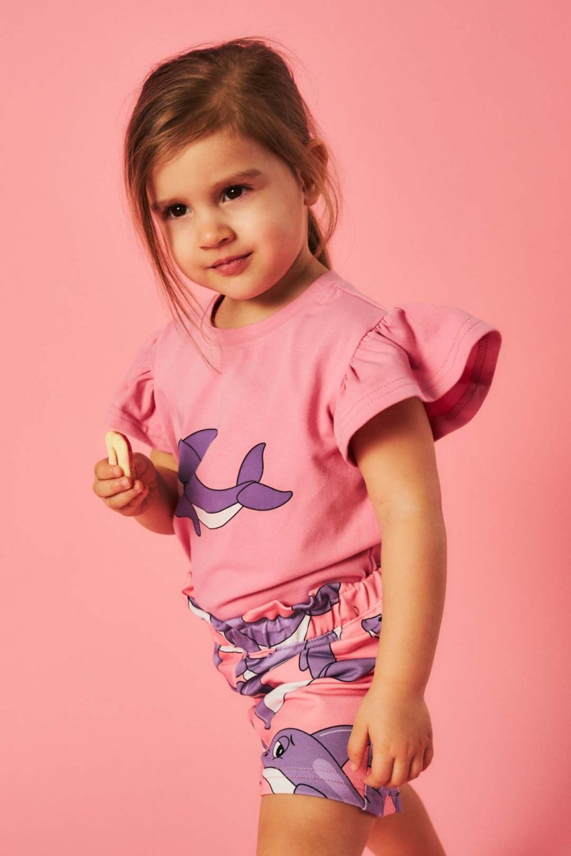 Rosa kortärmad t-shirt med ett Dolphin-print på bröstet, från Dear Sophies SS23-kollektion Chilli Vanilli. Tröjan har en rund halsringning och frills på ärmarna.