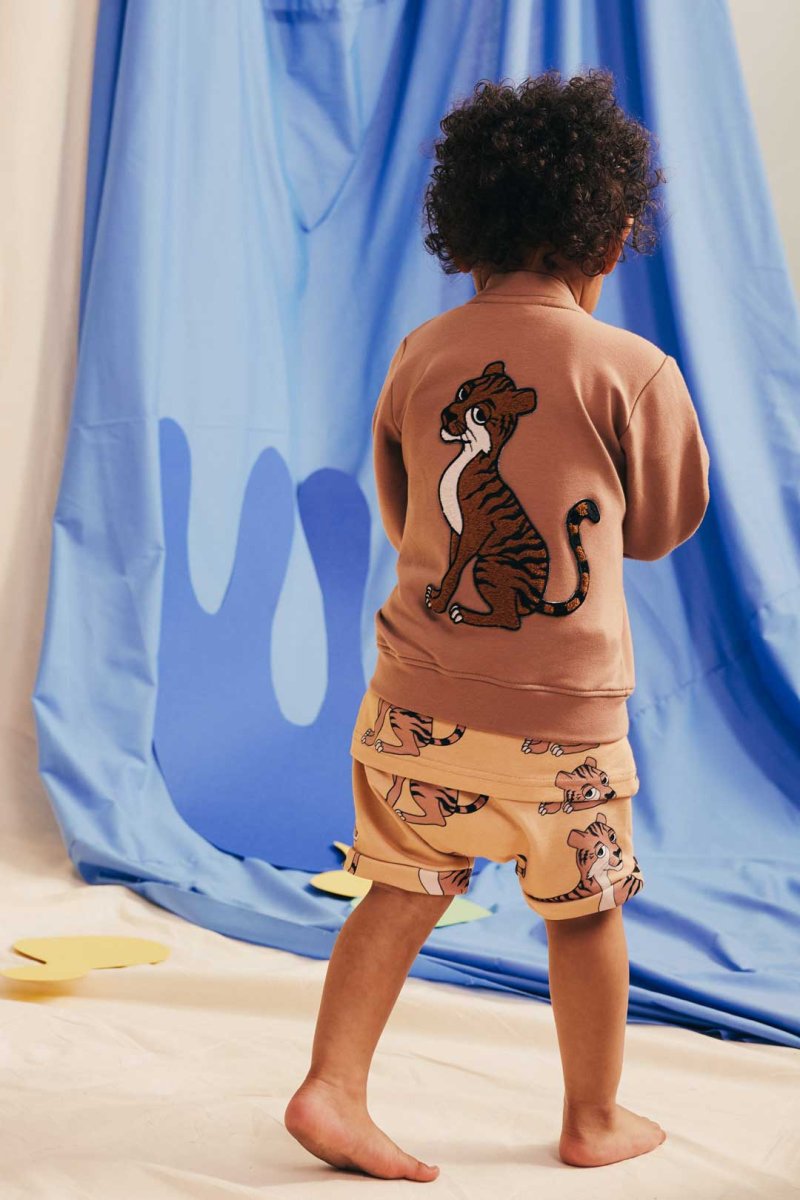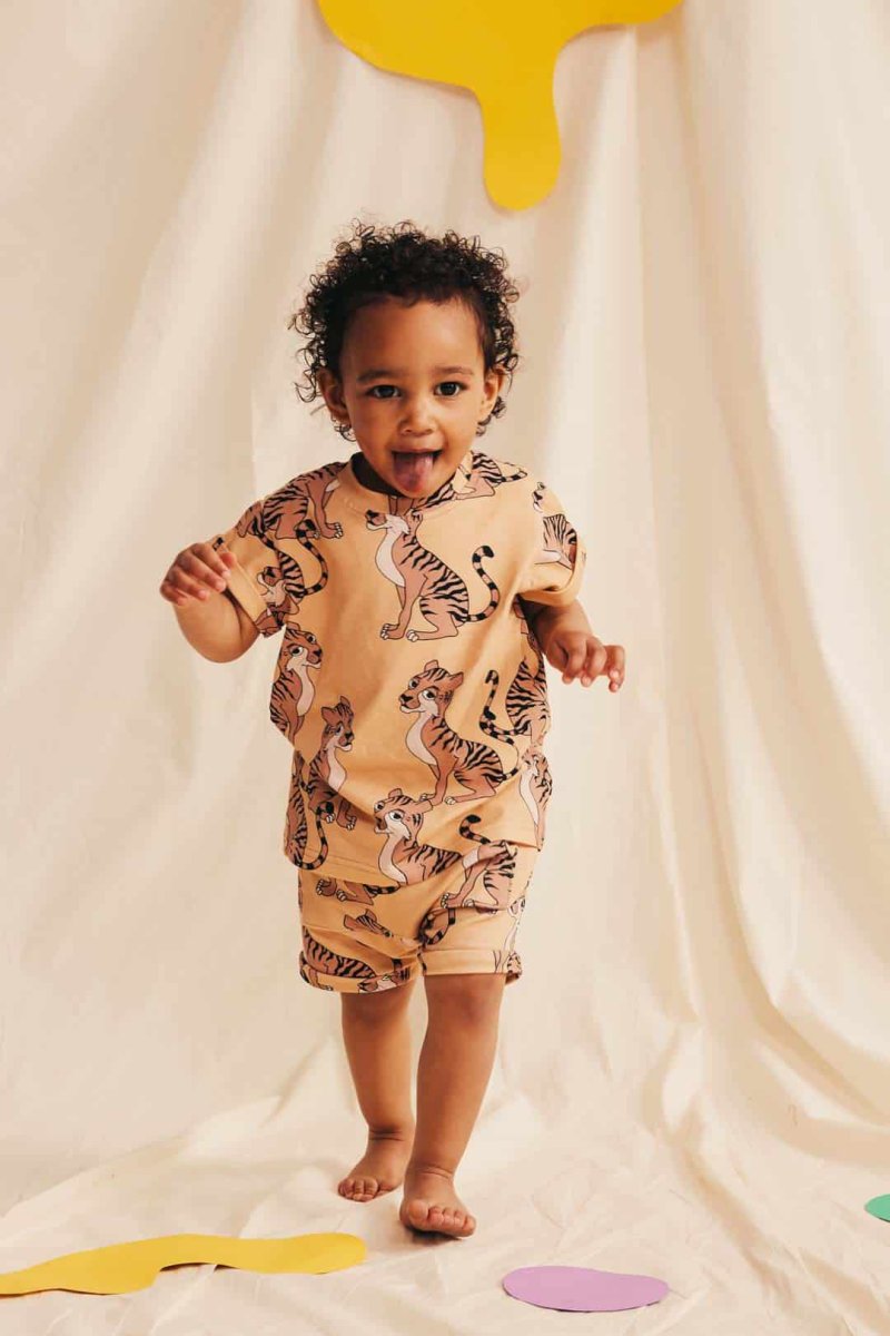 Gula shorts med tigrar, från Dear Sophies SS22-kollektion Ahoy! Designade med dragsko i midjan och praktisk ficka fram.
