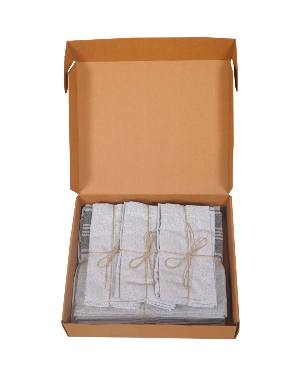 Duk 140×250 och 6 st servetter 45×45 i 99% återvunnet material inga tillsatta kemikalier eller färgämnen.