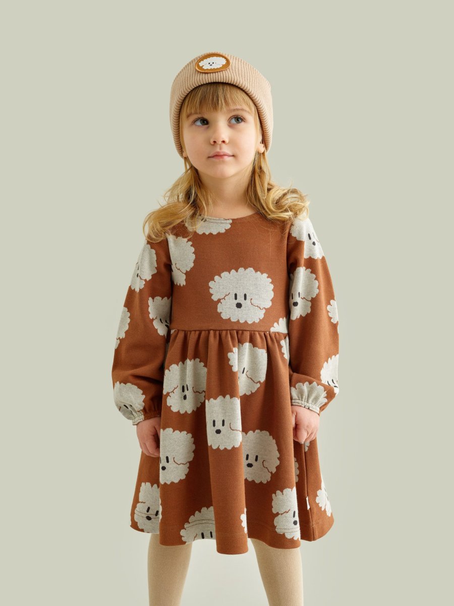 Stickad klänning med heltäckande Floof-print, från Mainios AW22-kollektion Future Hopes. Klänningen är designad med en rund halsringning och vid kjol.