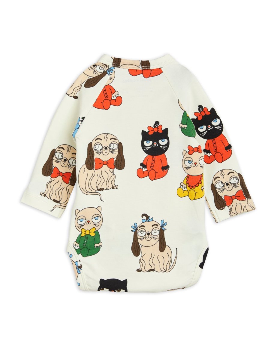 Omlottbody med heltäckande Mini Babies-print, tillverkad i GOTS-certifierad ekologisk bomull med stretch. Omlottbodyn är tillverkad i Mini Rodinis modell för nyfödda. Med tryckknapparna framtill och i grenen sveper du enkelt plagget om barnet istället för att trä det över huvudet.