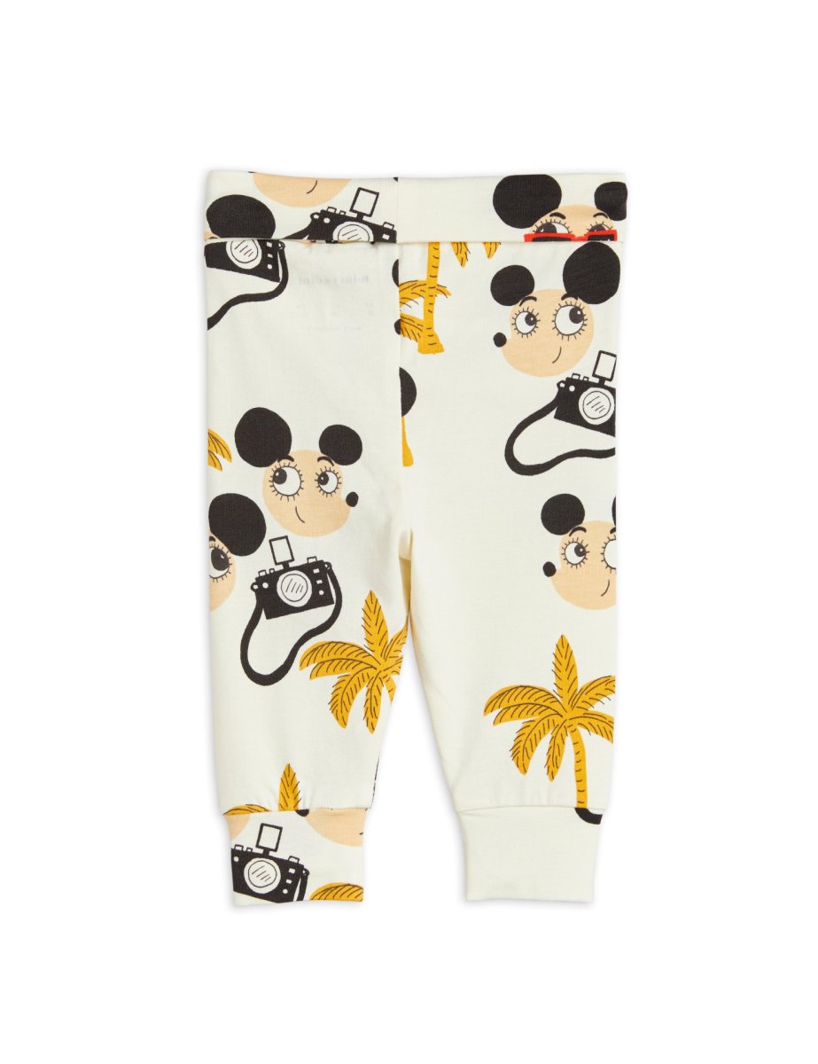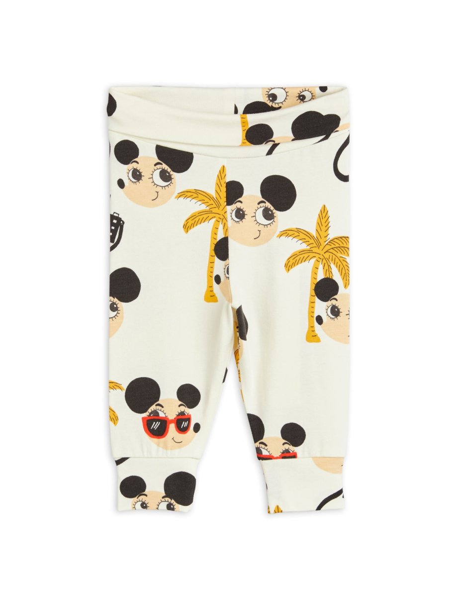 Off-white leggings för nyfödd med heltäckande Ritzratz-print, tillverkade i GOTS-certifierad ekologisk bomull med stretch. Leggingsen är tillverkade i Mini Rodinis modell för nyfödda. Designade med muddar i bensluten och en bredare mudd i midjan som kan vikas ut när barnet växer, vilket förlänger plaggets livslängd.