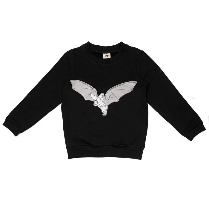 Svart långärmad sweatshirt med en fladdermus tryckt på bröstet – som lyser i mörker, från Mullidos AW22-kollektion Sri Lanka.