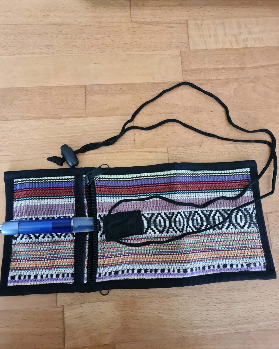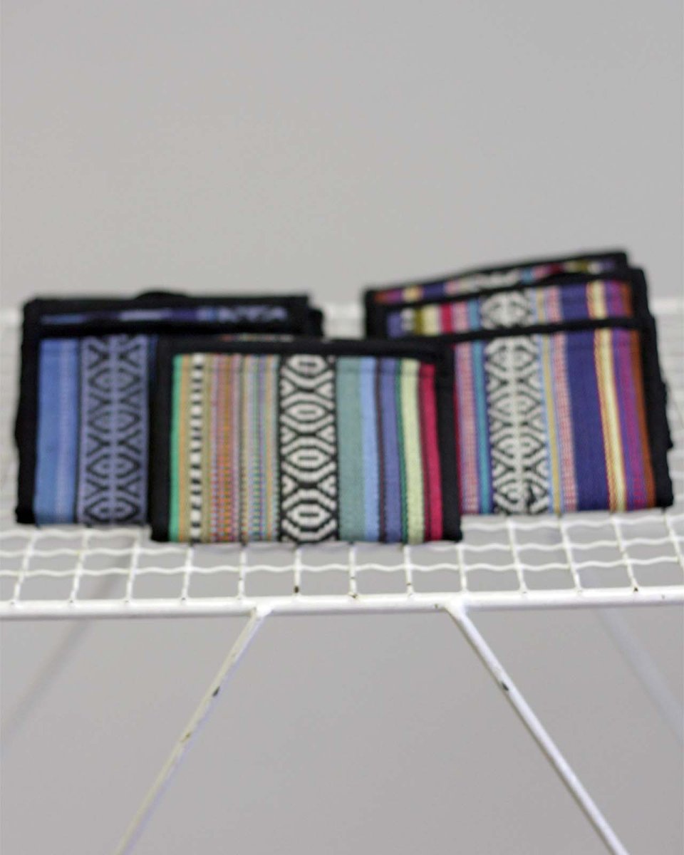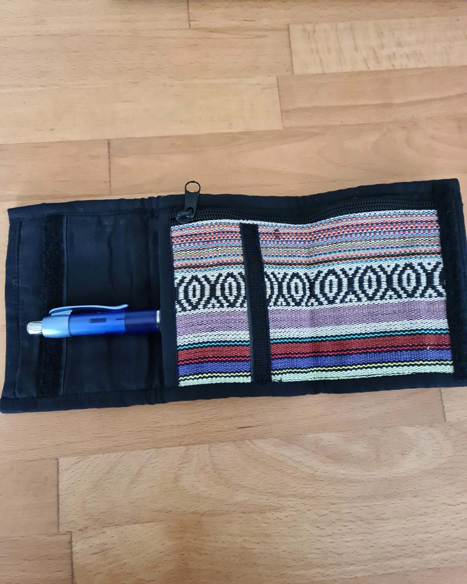 Ekologisk, vävd plånbok med fack och dragkedja. Finns även ett band så det kan bli en liten väska. Tillverkat av kvinnor i Indien som på grund av fattigdom fallit offer för människohandel.